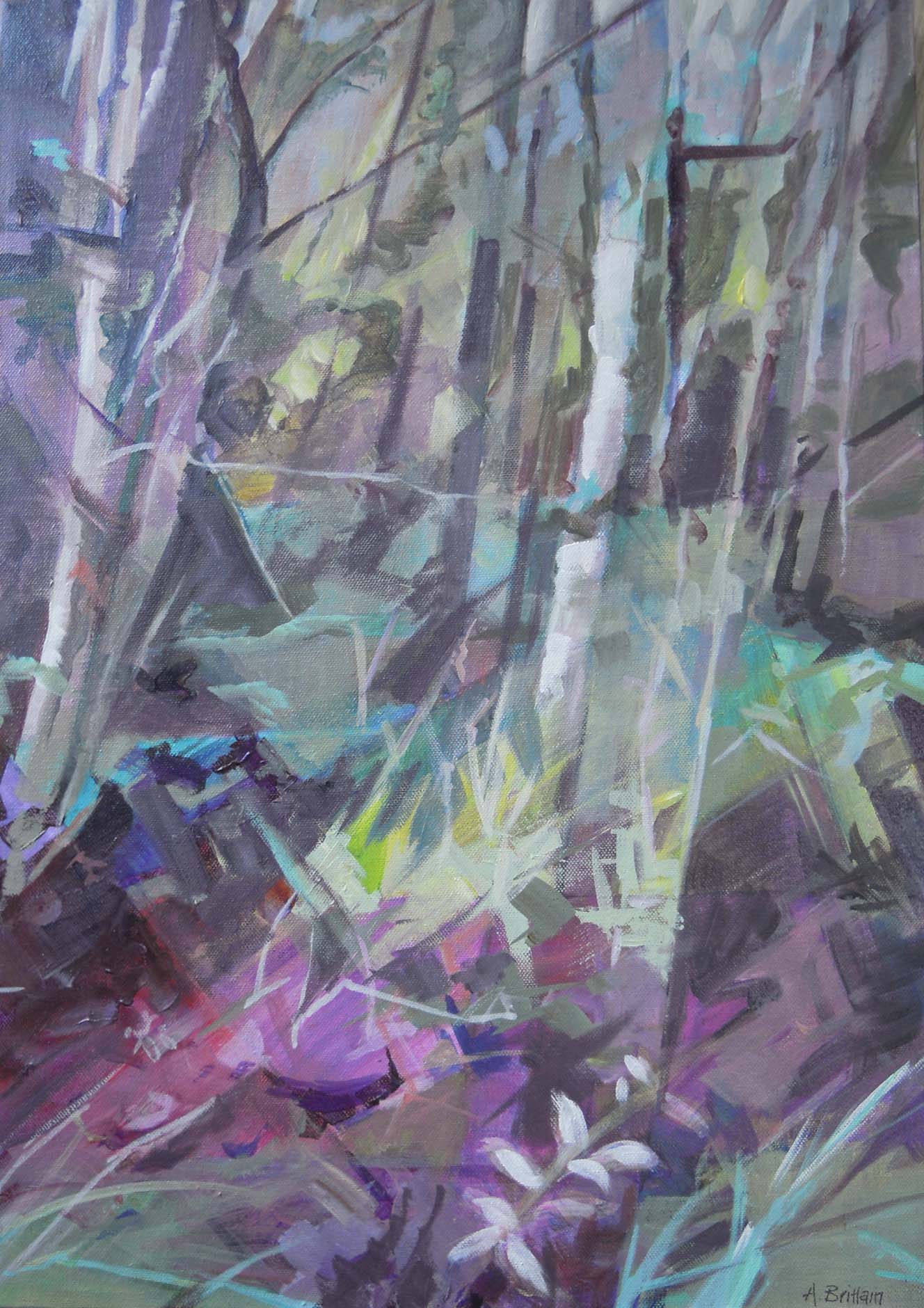 After a visit to Powdermills Woods near Battle, I wanted to paint what I had seen, enhancing the many colours of the undergrowth and wild flowers in a fractured way to give an indication of the dynamic nature of the way things grew.