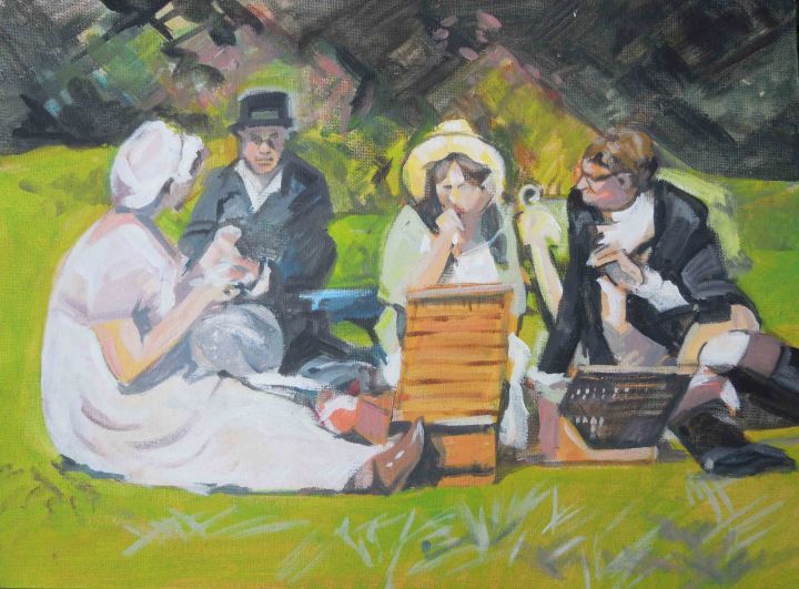 Had a lovely one-day workshop with Haidee-Jo Summers at the Mall Gallery yesterday. It was about creating figures in a lose way and not over-finishing. This is something I struggle with so it was such an enjoyable day. We were asked to paint a scene from an upside- down photograph. This was very liberating as it made me see the people as shapes rather than legs an arms. At times I felt as though I’d lost the proportions but was able to sort this out later as I was working in acrylics. Anyway, this was the result, called “Edwardian Picnic”. Have a go – it really helps. Not possible if you’re working from life, of course. The other thing she recommended was Windsor & Newton’s blue-black. We’re always told not to use black in a painting as it deadens everything but blue-black is a good mixer without doing this. I’m about to order some.