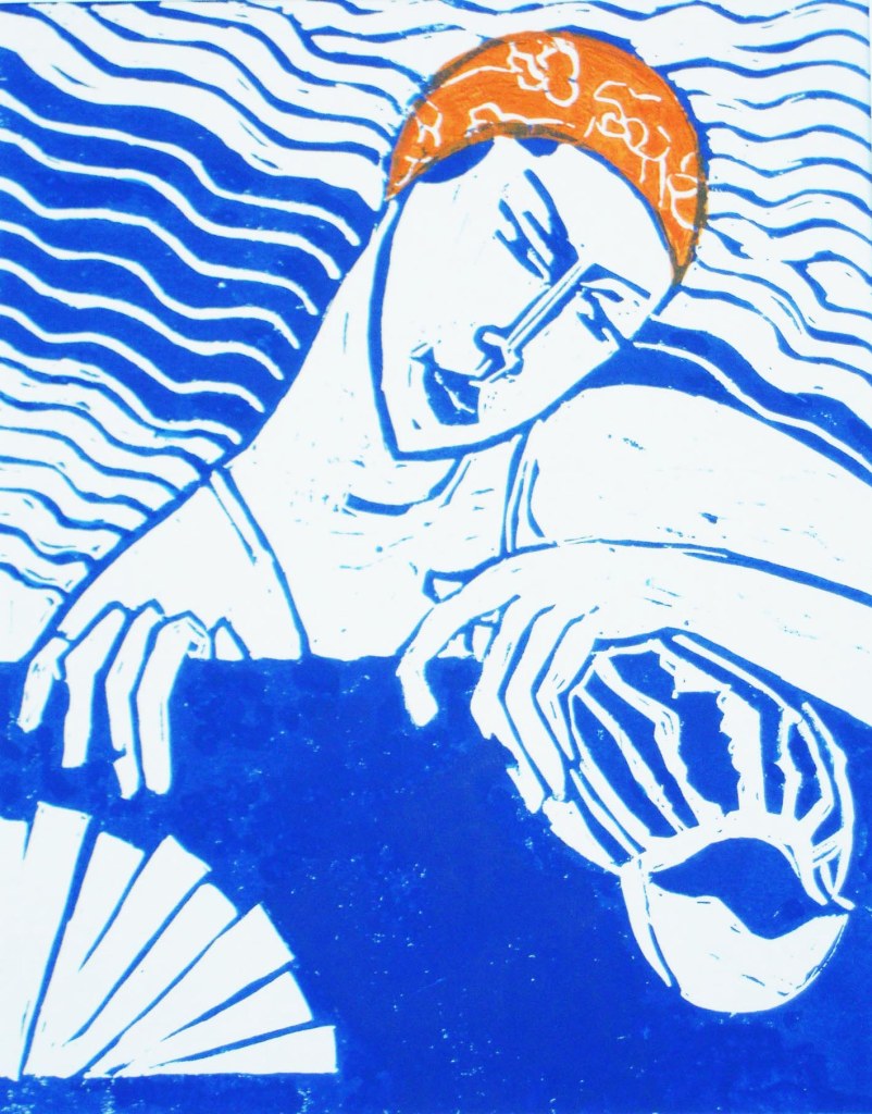 One of my few lino prints. I wanted a simple image that conveyed the relationship between the girl, the shells and the pattern of the water.