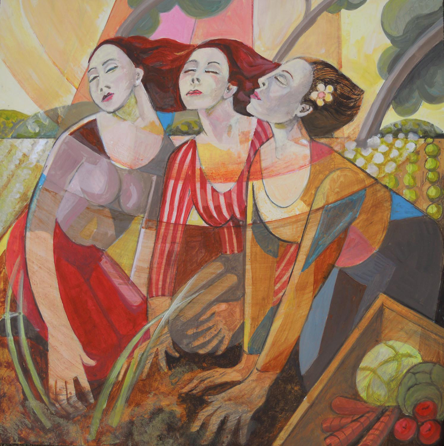 This painting was inspired by that lovely feeling when you go into the garden at the first showing of sunshine after the winter. As you work in the garden it uncurls the tension to feel the sun warm on your face even as your hands touch the cool earth.