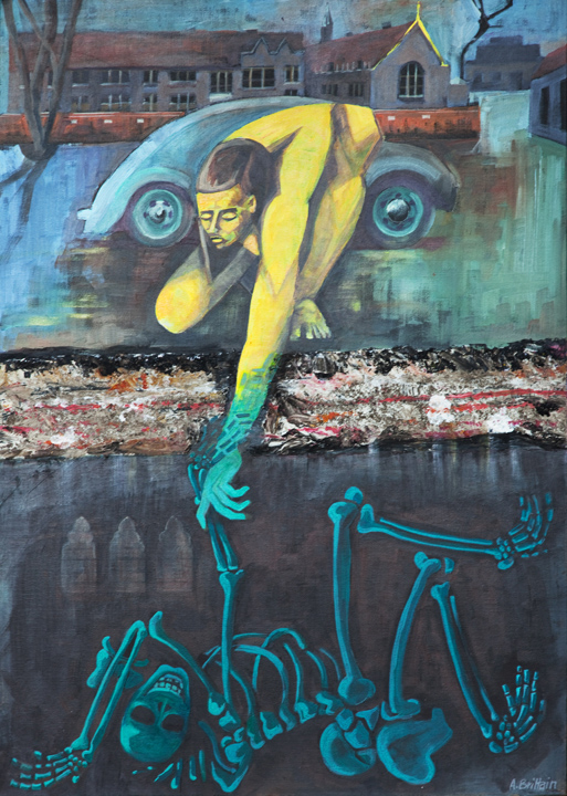 I was so impressed with the story of how the remains of King Richard 111 were located in a car park in Leicester that I felt inspired to do a painting of the scene. The yellow figure represents life, pulling Richard back into the world of the living.