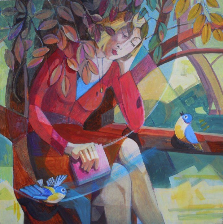 She is sitting in a tree, surrounded by nature, occasionally reading or watching the birds. This sense of peace and feeling at one with nature was something I wanted to capture in the painting