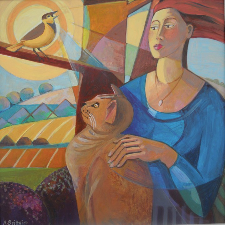 Her cat is feigning indifference but she feels drawn to the song of the lark that surrounds her.