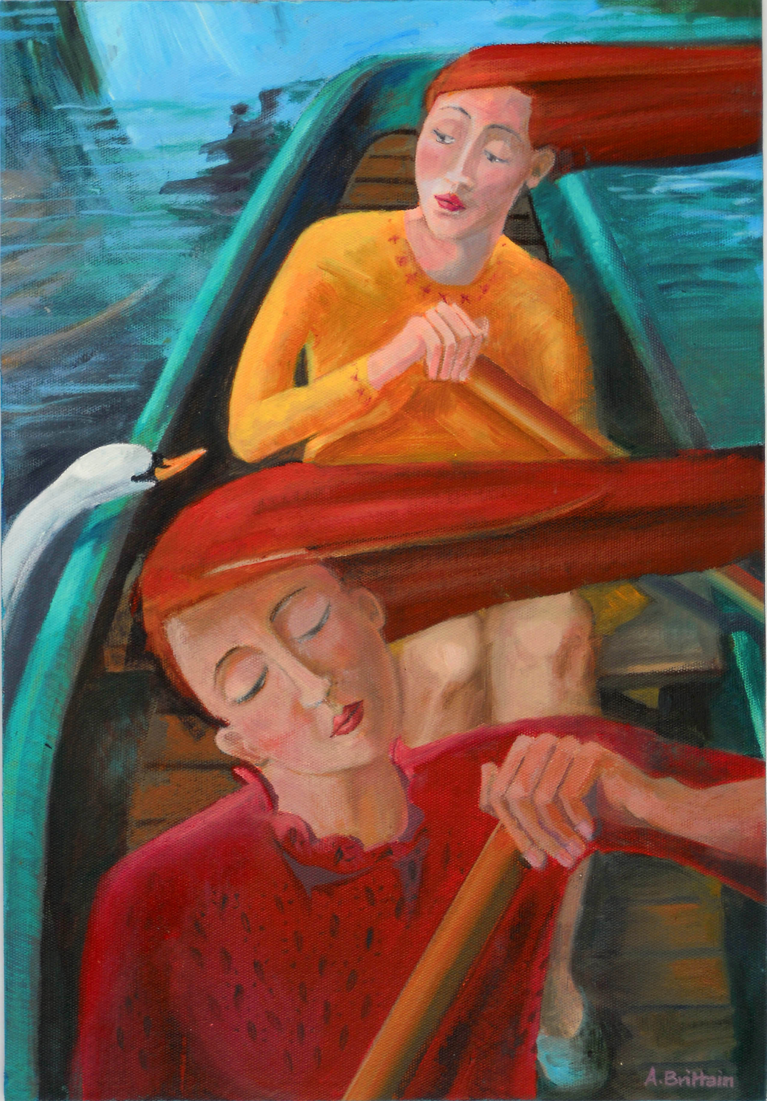 This is a modern take on the legend of Leda and the Swan. As they quietly paddle down the stream, they are oblivious to the danger the swan presents. The small figure in the background tries in vain to alert them.