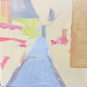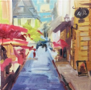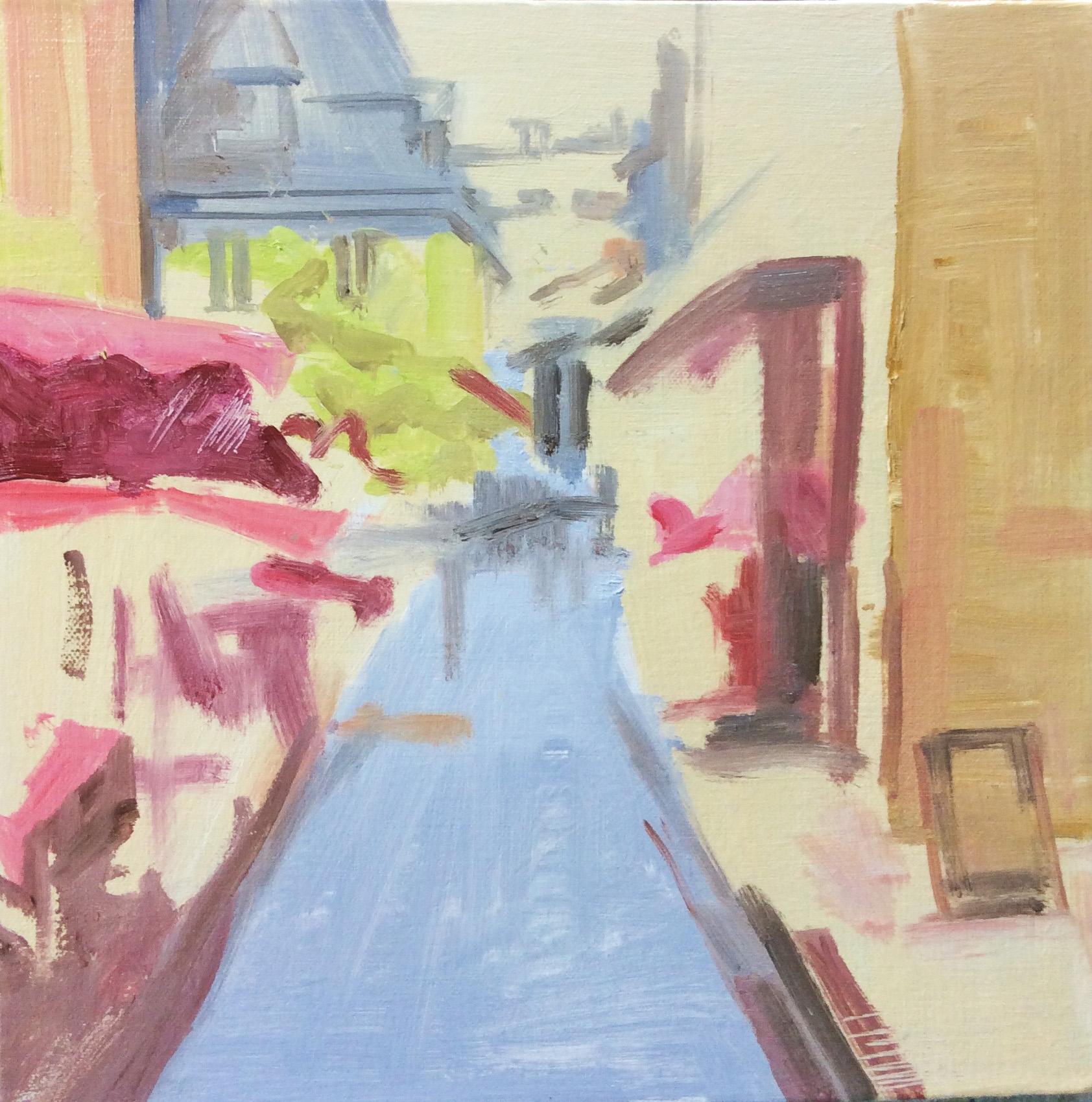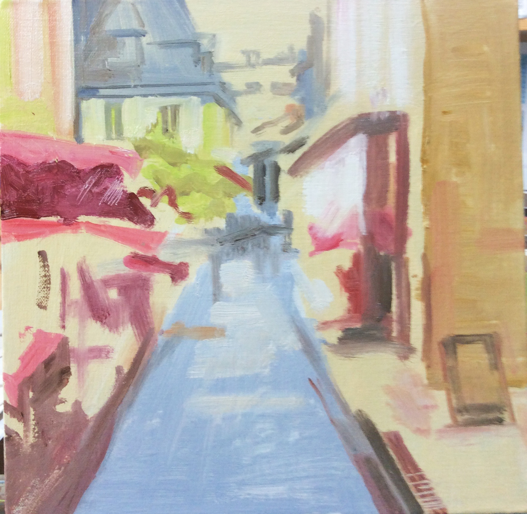 1. No styling here for this project – just a straightforward oil sketch of a street market in Abruzzo to demonstrate the stages. Starting with a warm colour where the buildings and a street market will go.