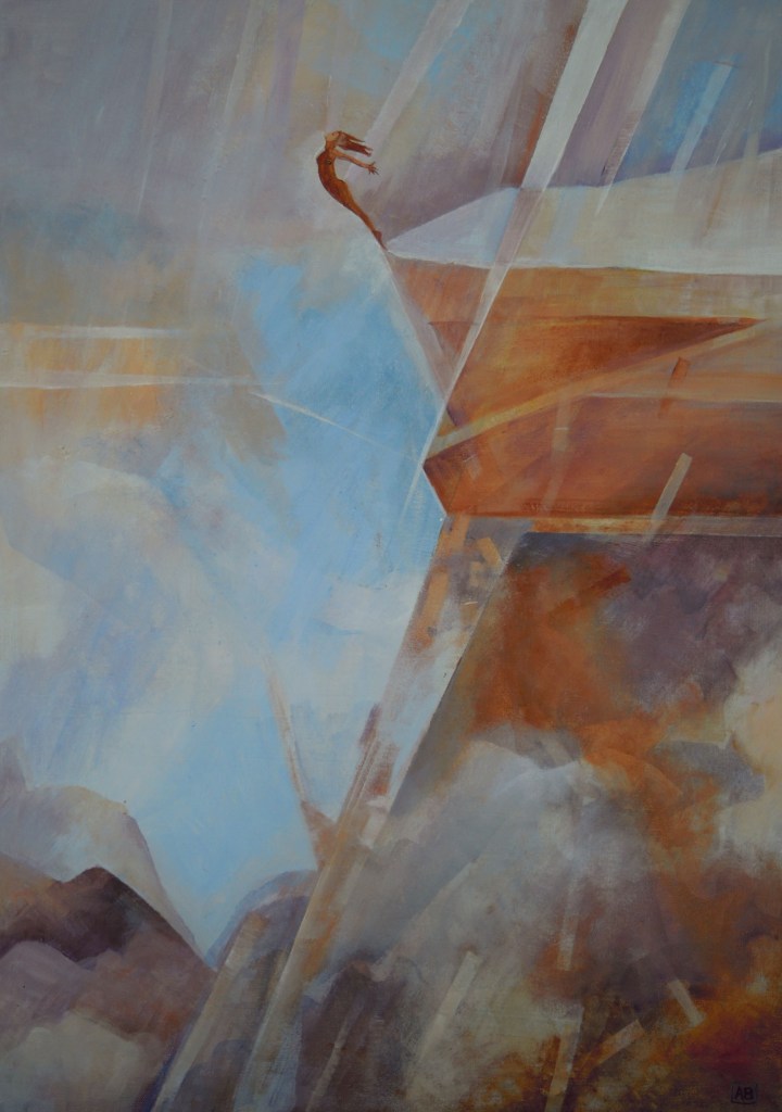59 x 84 cm. Acrylic on canvas. Following on from my semi-abstract painting called ‘Fire dance”, this painting is about the leap of faith we have to make in order to move out of our comfort zone and try something new. Whether that move is a change for the better or just a temporary departure, I will let you know as this is exactly what I am trying to achieve by moving my work into a more expressive and less realistic direction. One thing I do know, it was a very refreshing use of brush, sponge, fingers in fact anything that was messy- layer after layer. SOLD