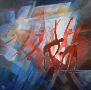50 x 50cm. Acrylic on canvas. This new semi-abstract painting is a composition in many layers, loosely depicting warming up in a gym with the mirrors seeing many images throughout a period a time. SOLD