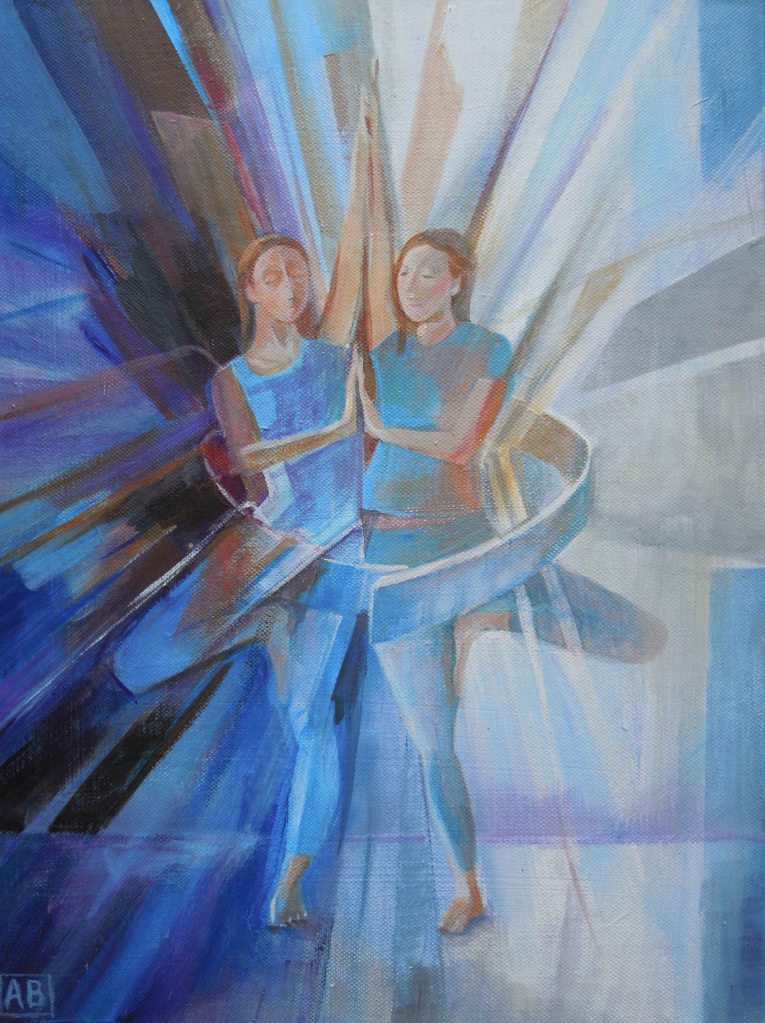Having done yoga for years, I thought my next painting should be about the little understood effect our minds have on our bodies. Trusting someone to do a partnering pose can be quite challenging and usually ends up in a heap and lots of laughter. The two ladies in my painting are concentrating hard and fortunately of a similar size and weight which always helps. Not sure why there is so much blue – perhaps it’s because the sun is shining today after so many grey days and there’s a perfect blue sky. This painting is called “Circle of Trust”. Acrylic on canvas. 34 x 45cm