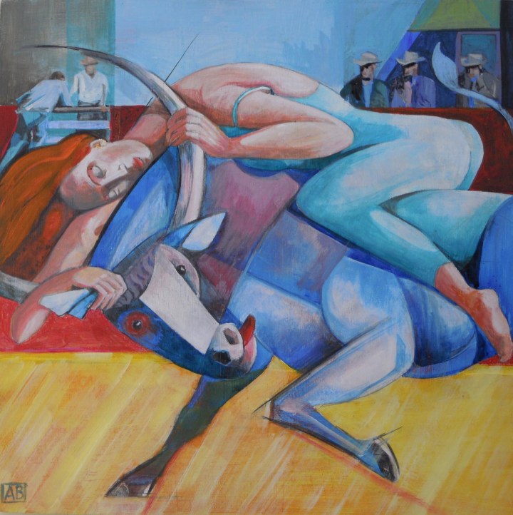 I’ve commenced my new Zodiac Series of paintings with Taurus. This painting called “Taurus tamed” was inspired by the characteristics of this star sign ( reliable, practical, ambitious and sensual with an eye for beauty) and something I read that for a bull-ride to count, the rider has to stay on it’s back for 8 minutes. It seemed that a softer, feminine approach with a degree of collaboration was going to win out over lots of male bravado so this is what I decided to paint. 30 x 30cm acrylic on wood. SOLD