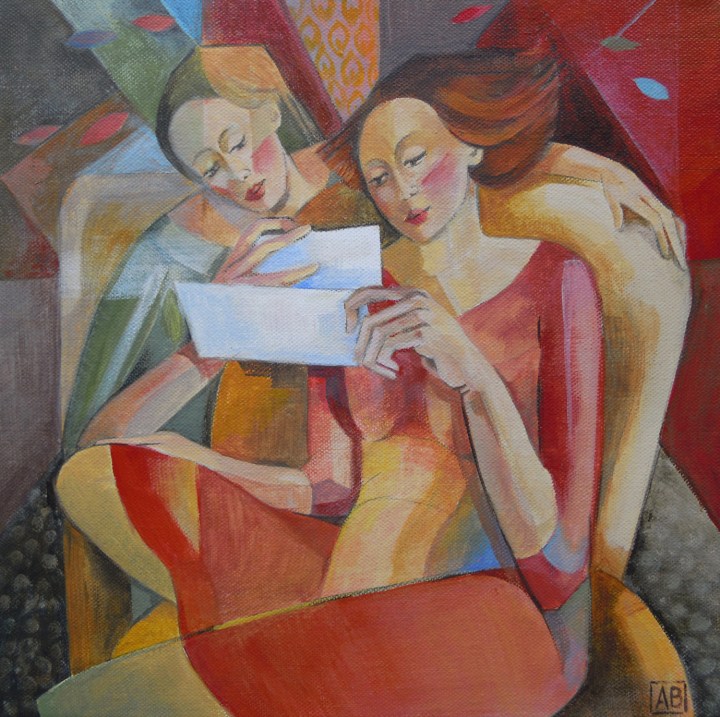 The second is “The invitation” 33x33cm acrylic on canvas. Curiosity to share two invitations and see if they are the same are linking two women here. SOLD