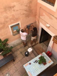 Just returned from 2 lovely weeks in Spoltore, Abruzzo where our house is being re-wired. Quite a challenge in an old house with very thick walls and EU regulations around earthing and siting of a new external ENEL box! I took this picture of Mario and Anthony, our italian electricians, determined to get their drill through a 2′ wall.