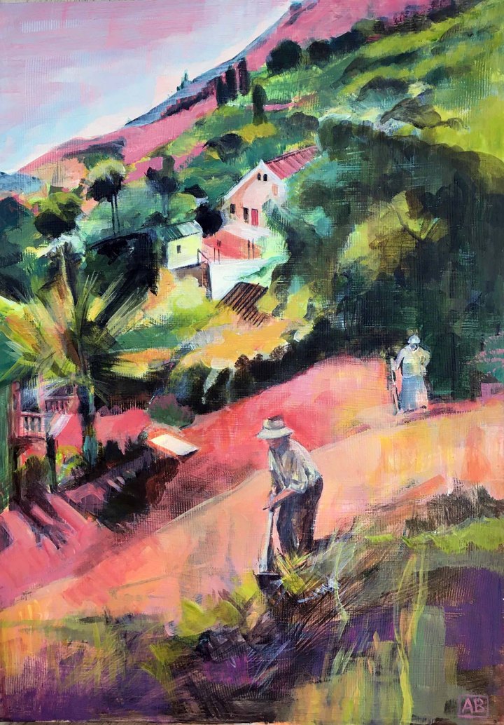 Not my usual style but I’m experimenting with making the landscape more dominant than the people. This is an imaginary landscape based on sketches and reference from my visit to Andalusia in Spain last year. Acrylic 60cm x 42cm
