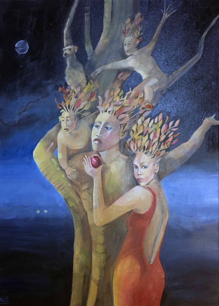 This painting in oil on canvas was inspired by a quote by Norman Borlaug who was an american Nobel Peace Prize winner in 1970. He said “Man’s survival from the time of Adam and Eve until the invention of agriculture must have been precarious because of his ability to ensure his food supply”