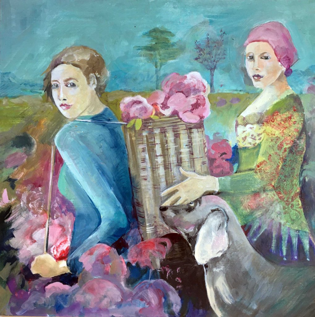 “Flower Thieves” Oil on Board 39 x 39cm. Caught in the act, these innocent looking ladies are stealing flowers to sell at the market. One stares back defiantly, confident you are not going to tell.