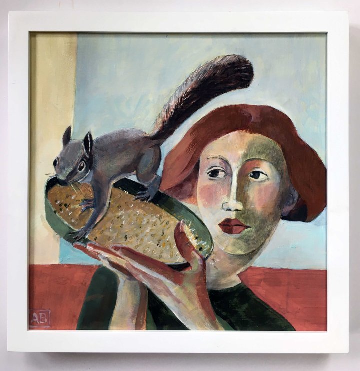 “Snack Time” was inspired by all the squirrels that come into our garden. We are close to the park so they are used to people and very cheeky. Sometimes they have a touch of red from their ancestors. They love it when there’s bird food about. Acrylic on wood panel 34 x34 cm. SOLD