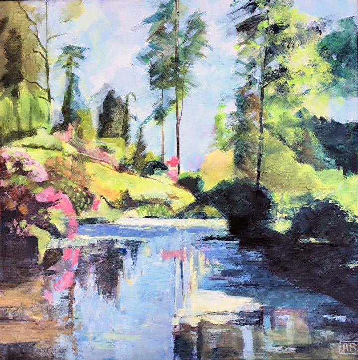 “Leonardslee Gardens”. A painting in acrylic on canvas. 70 x 70cm. I was inspired by a lovely view on a walk around the lake and decided a landscape would make a nice change from my usual people paintings.