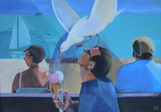 Had some fun with my latest painting. Called “Smash & Grab”, this acrylic is about the growing boldness of seagulls who spot their next victim and swoop down to share a delicious ice cream. Fun, yes, but also a nuisance. 42 x 59cm.