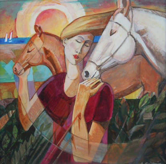 The silent bond between people and horses. Their awesome power and her tenderness captured in a small gesture. Acrylic on wood panel 30 x 30cm