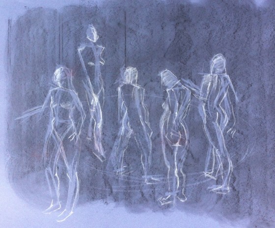 A series of quick sketches completed this week of a woman as she moved around the studio. Fortunately, it was really warm in there as we arrived in coats and scarves!