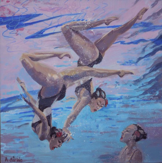 Whilst the synchronized team are all smiles on the surface, as they slide under the water, out of the sight of the judges, a swimmer takes her revenge on a team member for a poor move Acrylic on canvas 30 x 30cm SOLD