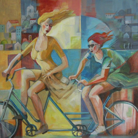 Another new painting for the new year. The tandem provides the perfect vehicle to take turns to burn calories. SOLD